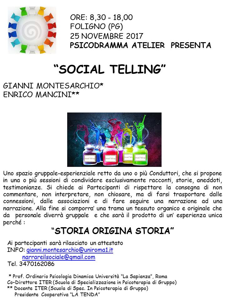 Nel rinnovarvi l’invito a partecipare alla giornata di “Social Telling” del prossimo 25 novembre, a cui diversi di voi hanno già aderito, inviamo il programma dettagliato della giornata che procederà attraverso quattro sessioni di lavoro in gruppo condotte da Gianni Montesarchio ed Enrico Mancini.
