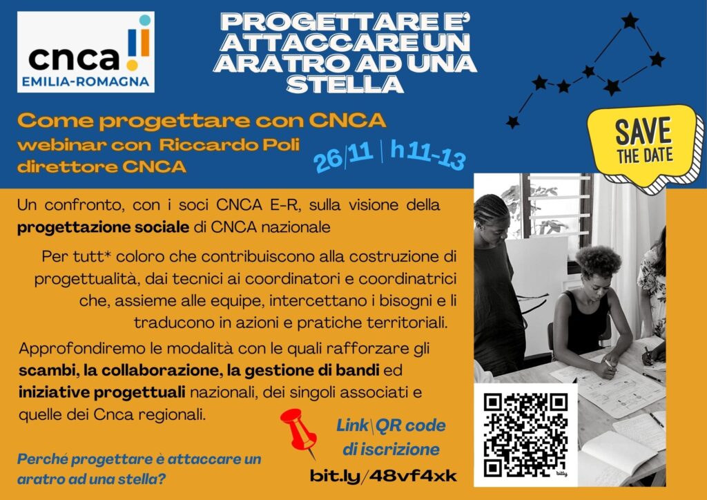 'Progettare è attaccare un aratro a una stella' Webinar 26 novembre 2024 dalle ore 11.00 alle 13.00 Le attività di progettazione sociale nel CNCA, un confronto con Riccardo