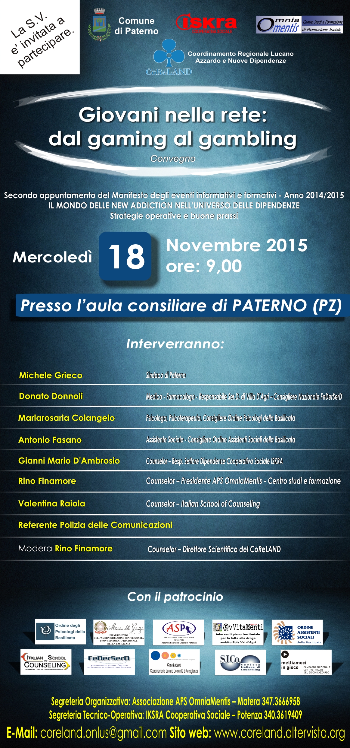 Si terrà a Paterno (Potenza), il 18 novembre 2015, il convegno “Giovani nella rete: dal gaming al gambling”, organizzato da Comune di Paterno, Coreland, cooperativa sociale Iskra e Omnia Mentis.